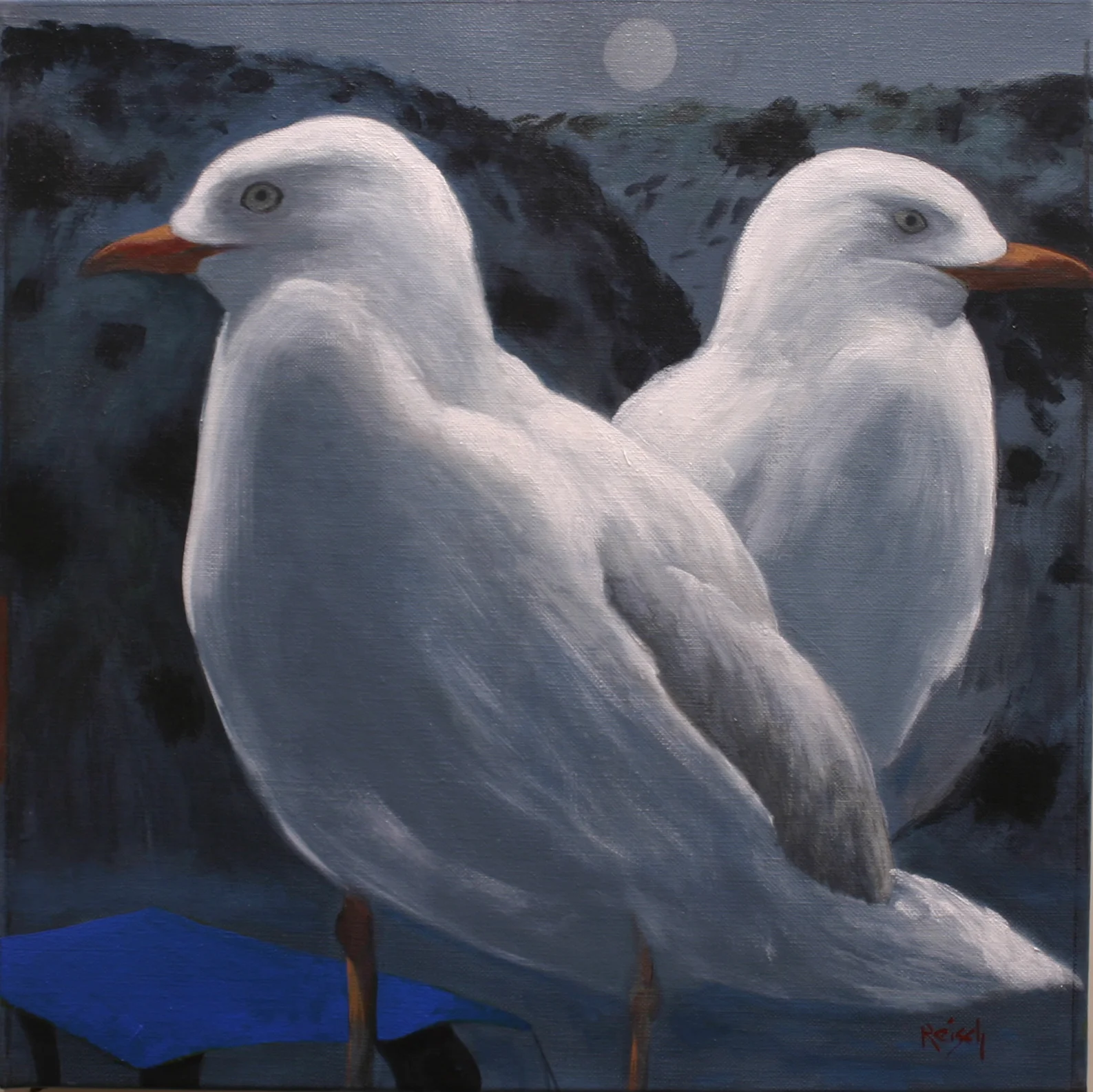 The motivation for the paintings is to formalise the narrative that informs my vision of the world. This vision is metaphysical influenced by the 15 century Italian Renaissance, Georgio De Chirico and Philip Guston. This informed my approach both in painting technique, composition, aesthetics and intention. The use of the square as the preferred ‘shaped canvas’ is deliberate. Its intention is to negate the idea of the traditional rectangle. The subject is the Hawkesbury River with its dramatic landscape, the allegory of the river, its indigenous history and the impact of white settlement including the industrial rebranding of the environment as a working river and tourism location.